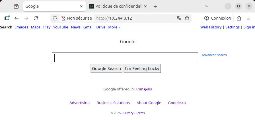 Note: Remarquer que nginx-service est maintenant de type ‘LoadBalancer‘. Remarquer aussi que ‘EXTERNAL-IP‘ est <pending> car sous minikube, la gestion des adresses externes est légèrement différente. Nous aurons une étape de plus à réaliser avant que le serveur Web soit disponible via notre poste de travail.