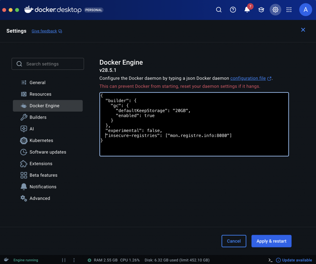 6 – Docker:Settings – Registres non sécurisés