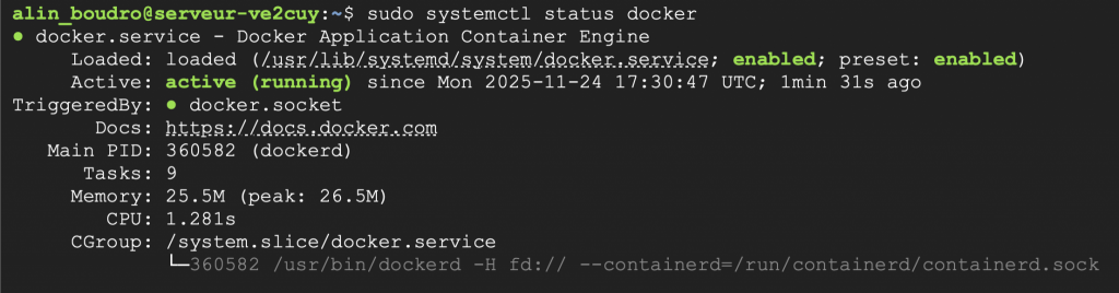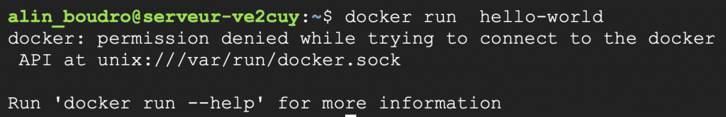 # Si le groupe docker n'est pas présent, il faut le créer grep docker /etc/group sudo groupadd docker # Ajouter l'utilisateur courant au groupe sudo usermod -aG docker $USER # Actualiser le changement au groupe docker newgrp docker # La commande suivante devrait maintenant fonctionner au niveau de l'utilisateur courant: docker run hello-world