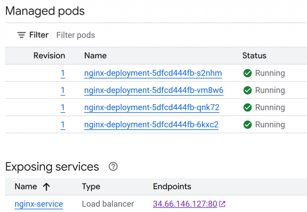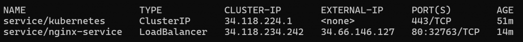 Z:\>kubectl get all NAME TYPE CLUSTER-IP EXTERNAL-IP PORT(S) AGE service/kubernetes ClusterIP 34.118.224.1 <none> 443/TCP 31m