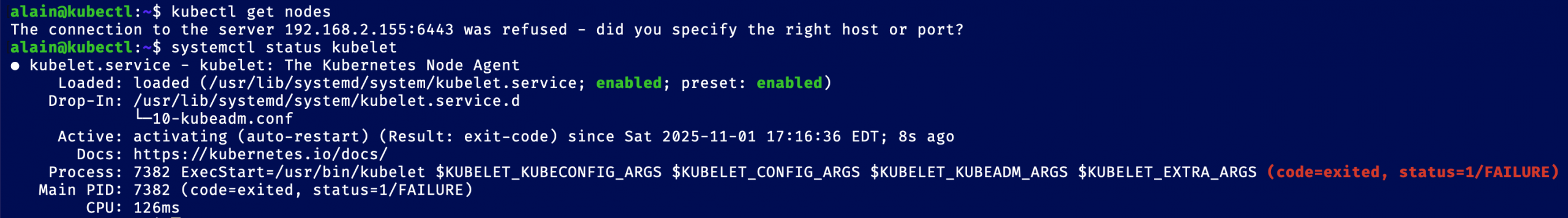 alain@kubectl:~$ kubectl get nodes The connection to the server 192.168.2.155:6443 was refused - did you specify the right host or port? systemctl status kubelet # Il faudra afficher le journal de l'application: journalctl -fu kubelet Une cause possible: Nov 01 17:12:10 kubectl kubelet[7023]: E1101 17:12:10.263490 7023 run.go:74] "command failed" err="failed to run Kubelet: running with swap on is not supported, please disable swap! or set --fail-swap-on flag to false. /proc/swaps contained: [Filename\t\t\t\tType\t\tSize\t\tUsed\t\tPriority /swap.img file\t\t4009980\t\t0\t\t-2]" Nov 01 17:12:10 kubectl systemd[1]: kubelet.service: Main process exited, code=exited, status=1/FAILURE