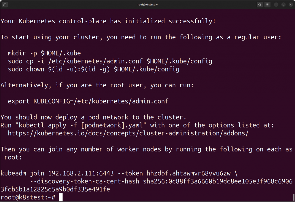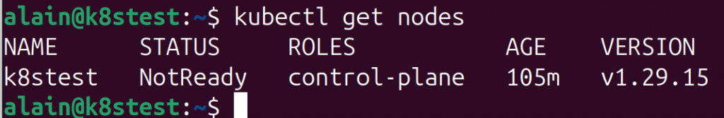 $ kubectl get nodes NAME STATUS ROLES AGE VERSION k8stest Ready control-plane 114m v1.29.15 $ kubectl get pods -n kube-system NAME READY STATUS RESTARTS AGE coredns-76f75df574-kbl8m 1/1 Running 0 114m coredns-76f75df574-xqr62 1/1 Running 0 114m etcd-k8stest 1/1 Running 0 114m kube-apiserver-k8stest 1/1 Running 0 114m kube-controller-manager-k8stest 1/1 Running 0 114m kube-proxy-j6zbq 1/1 Running 0 114m kube-scheduler-k8stest 1/1 Running 0 114m